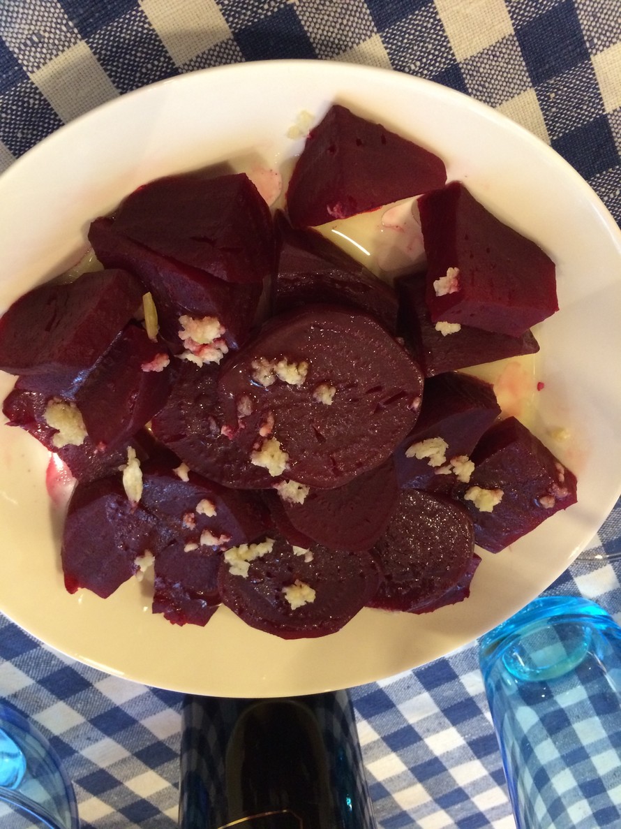Kuori kypsät punajuuret ja viipaloi tai lohko ne haluamaasi muotoon reilun kokoisiksi paloiksi. Puserra valkosipulin kynnet punajuurien päälle ja lorauta lautaselle oliiviöljyä. Purista punajuurille sirtruunamehua maun mukaan.