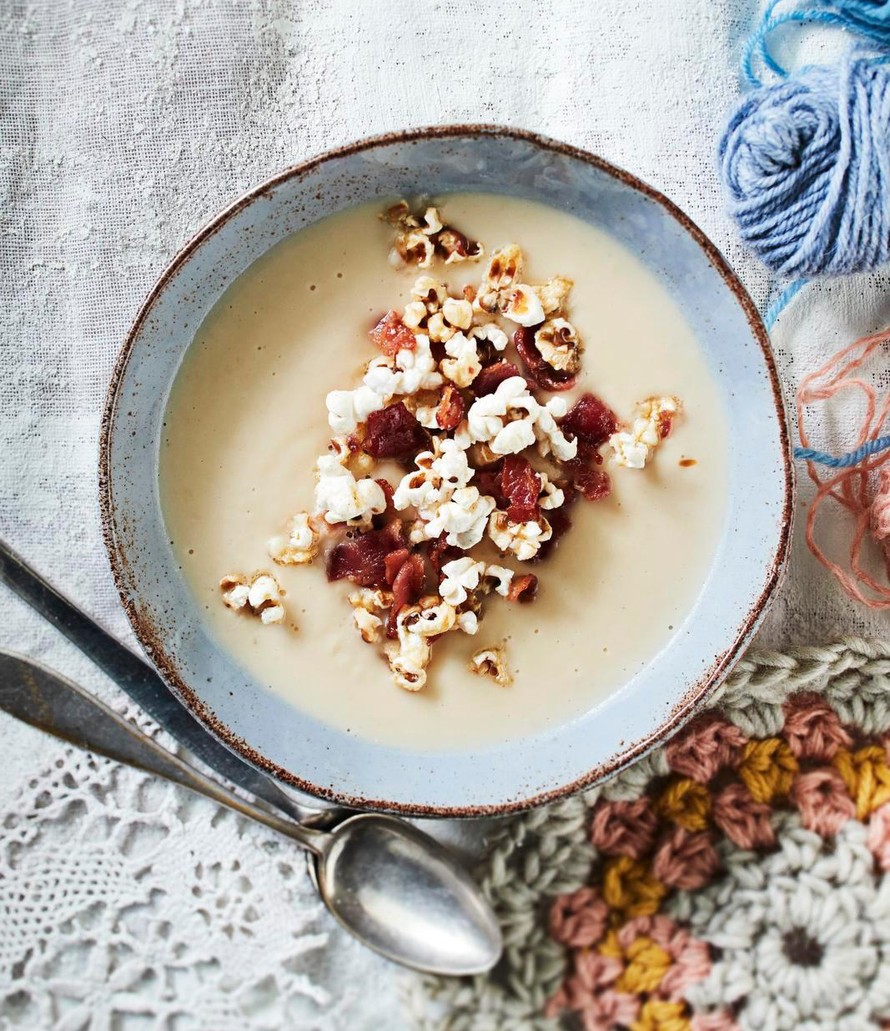 - Soseuta keitto. Lisää joukkoon kerma ja mausteet. Soseuta vielä kerran. Jaa kulhoihin ja ripottele päälle pekonipopcornia.