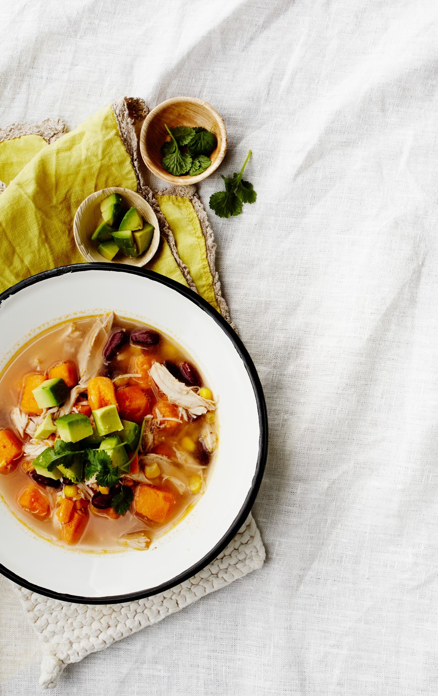 - Lisää keittokattilaan pakastemaissit ja kidneypavut. Kuumenna kiehuvaksi ja siirrä pois liedeltä. Lisää keittoon riivitty broileri ja mausta keitto puristetulla limetinmehulla. Tarkista suola.