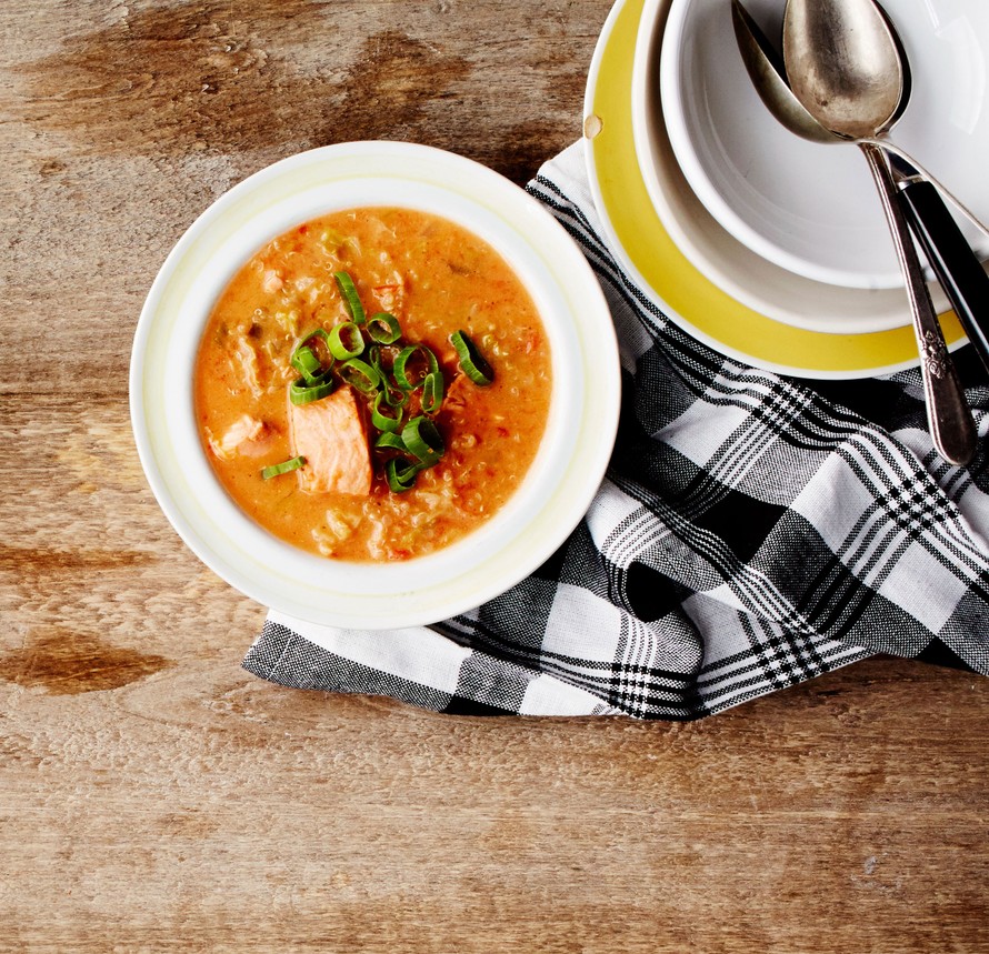 Lohikeitto saa uutta vääntöä kookosmaidosta ja kvinoasta.