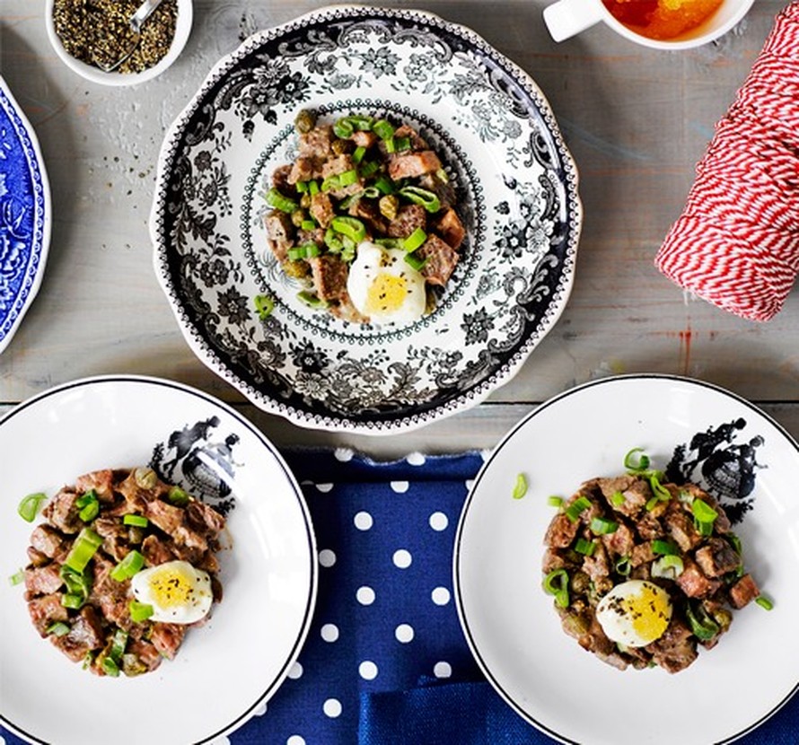 - Leikkaa kevätsipuli renkaiksi. Sekoita ne kapristen, sinapin, suolan ja mustapippurin kanssa lihapalojen joukkoon.