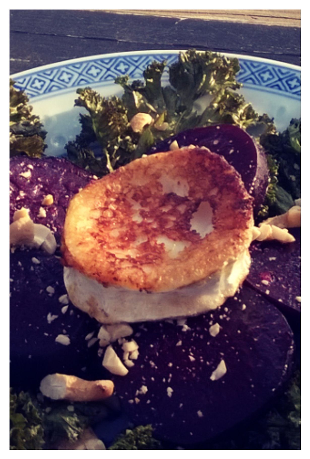 (Kuvan salaatin ohje: Punajuurta ja vuohenjuustoa rapealla lehtikaalipedillä)
