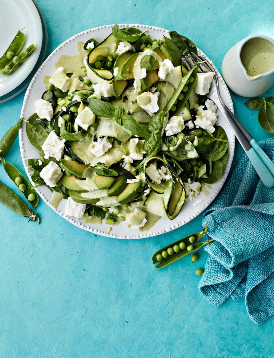 Vihreään kesäsalaattiin sujahtavat niin tuoreet herneet kuin kesäkurpitsakin. Salaattipohja kannattaa koota yrteistä ja muista maukkaista lehdistä tavallisen jäävuorisalaatin sijaan.