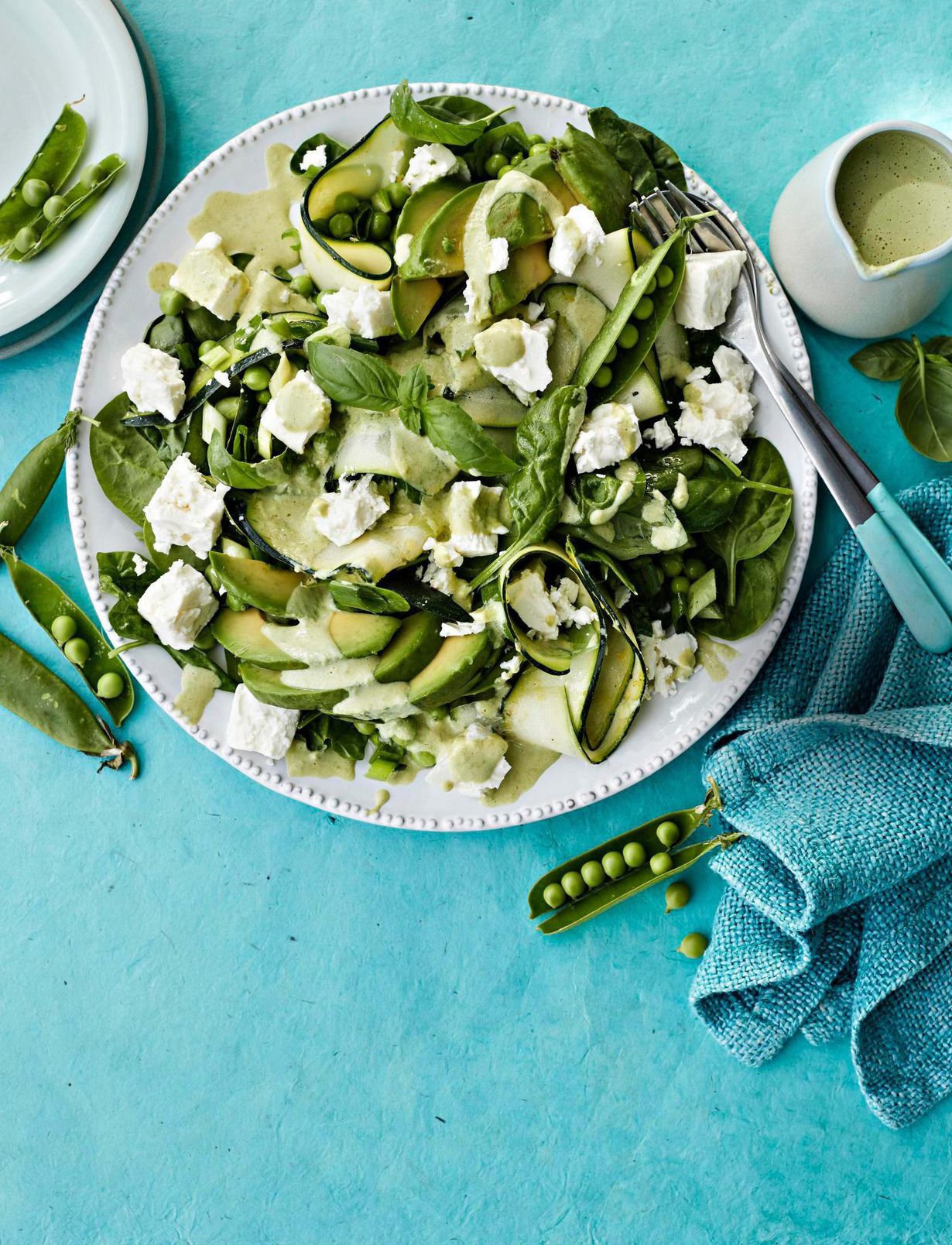 - Riivi herneet, ota 1 dl sivuun kastiketta varten. Halkaise avokado, poista kivi ja kuori, viipaloi avokadot siivuiksi ja laita kulhoon. Raasta joukkoonsitruunan kuoren keltainen osa ja purista päälle 2 rkl mehua. Purista loppu mehu sauva- tai tehosekoittimen kulhoon kastiketta varten. Veistä kesäkurpitsa kuorimaveitsellä ohuiksi suikaleiksi. Hienonna sipulit, huuhtele pinaatti ja basilika. Valuta feta.