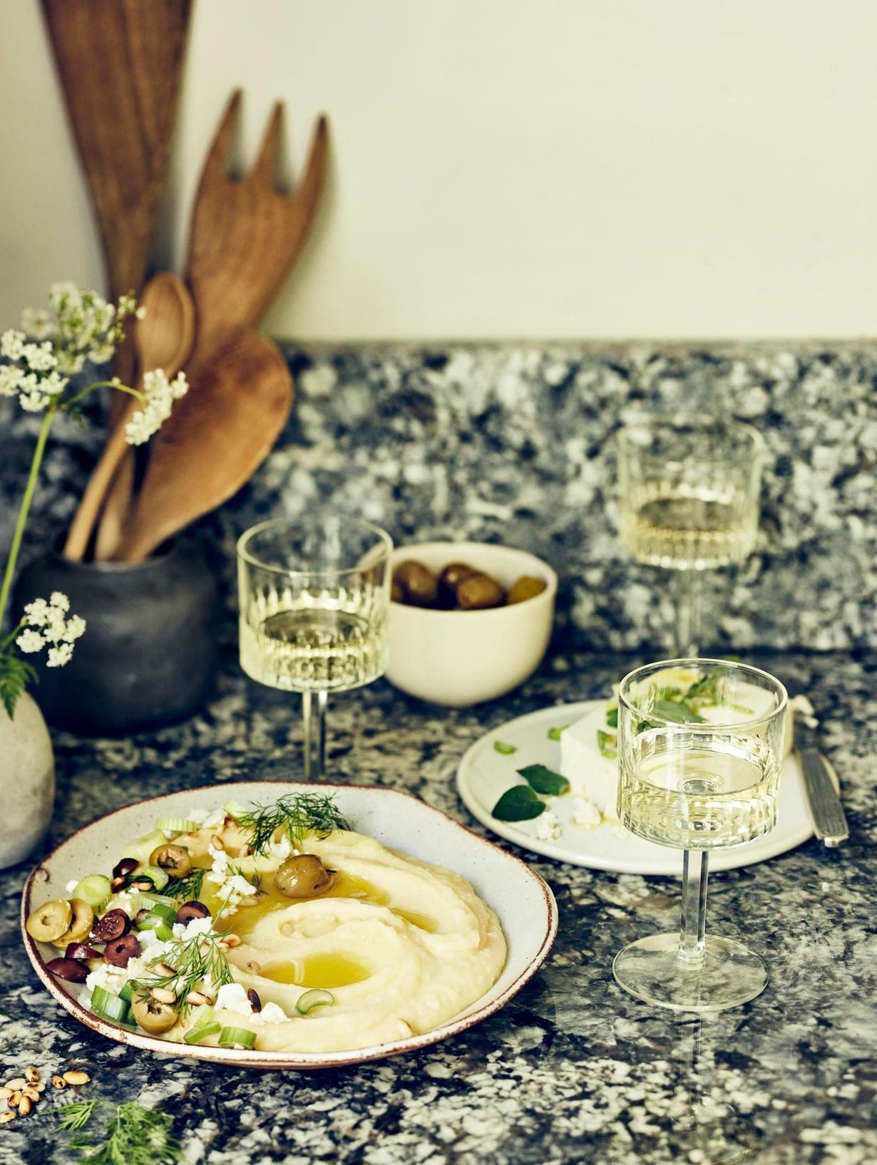 Tee se kreikkalaisittain ja tarjoa peruna alkuruokana meheväksi dipiksi muhennettuna. Lastaa päälle mezejä: oliiveja, yrttejä, pähkinöitä ja fetaa.