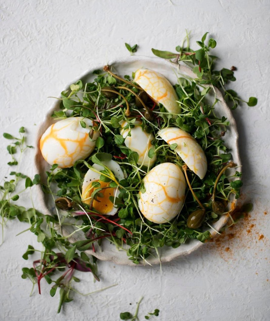 Vinkki! Hauskan pedin kananmunille saat esimerkiksi versoseoksesta. Lisää päälle kapriksia, siemeniä, tilkka oliiviöljyä ja ripaus suolaa ja pippuria.