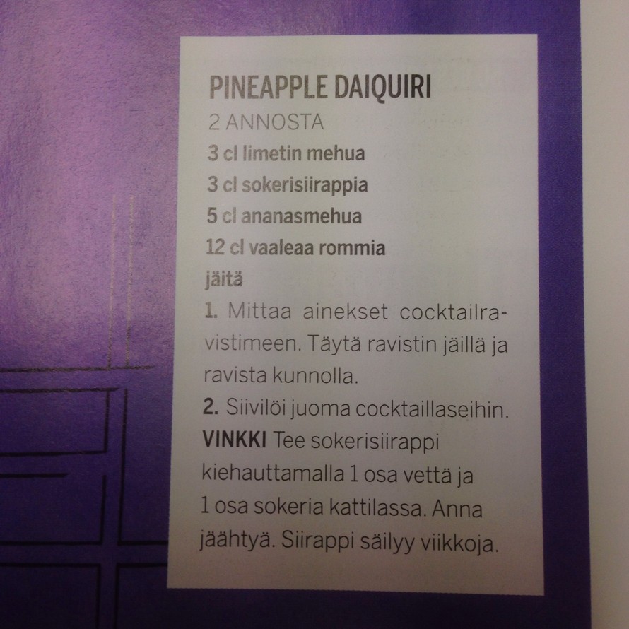 9:30 | 22.9.2014 Ananas daiquiri Lisää omaan keittokirjaan Hanna Jensen_2 on lisännyt 9 reseptiä Sisältö jatkuu mainoksen alla Sisältö jatkuu mainoksen alla Ananas daiquiri Lisää kokoelmaan Like 6 Ainesosat Vaiheet Tilaa Glorian ruoka & viini