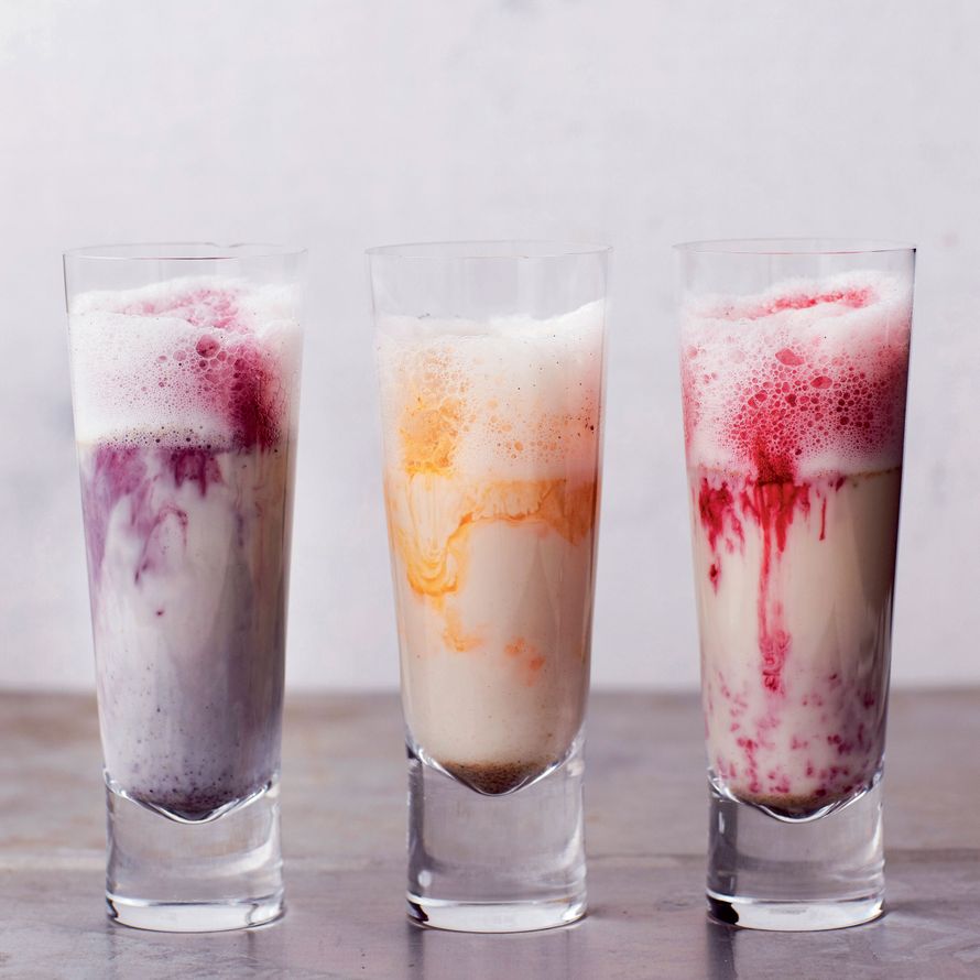 - Painele marjoja tiheässä siivilässä, jotta niistä irtoaa mehu. Jaa mehu kahteen korkeaan lasiin.
