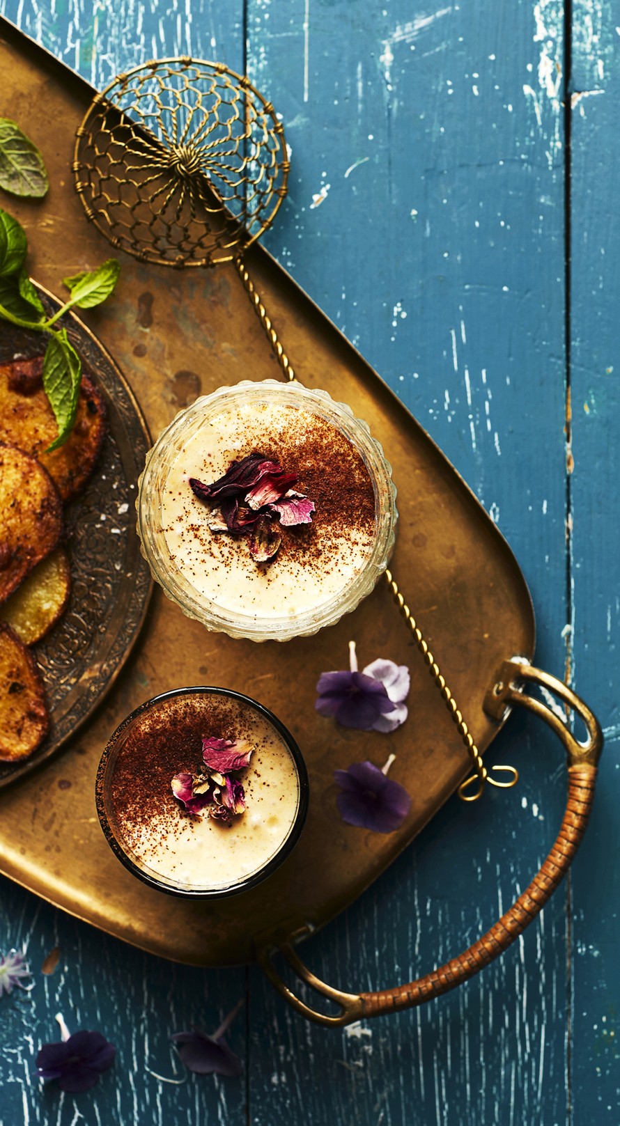 Soseuta kaikki ainekset blenderissä tai sauvasekoittimella keskenään. Lisää mantelimaitoa, kunnes juoma on sopivan paksuista.