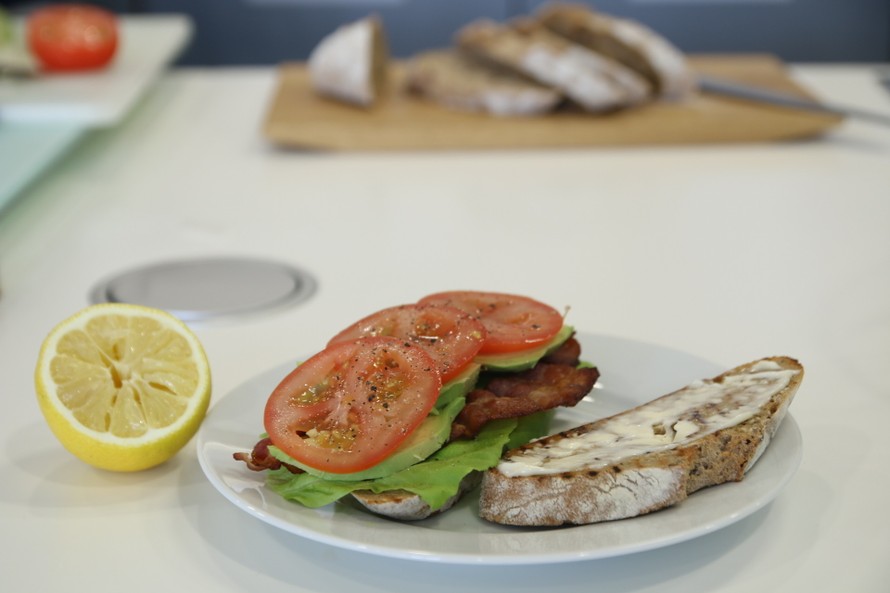 Pekonilla, salaatilla, tomaatilla ja avokadolla täytetty voileipä vie nälän yhtä nopeasti kuin se valmistuu.