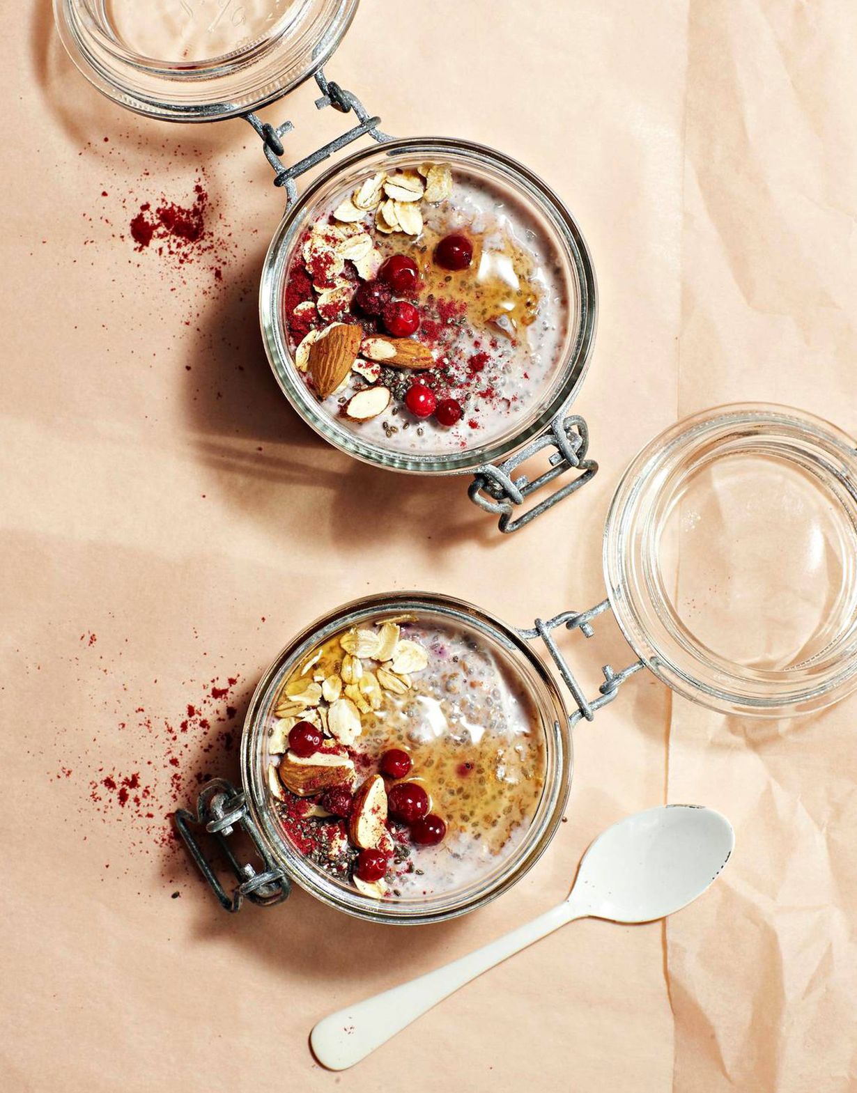 - Sekoita kaikki puuron ainekset keskenään kulhossa. Jaa annoskulhoihin. Anna puurojen tekeytyä peitettyinä jääkaapissa vähintään tunti tai seuraavaan aamuun.