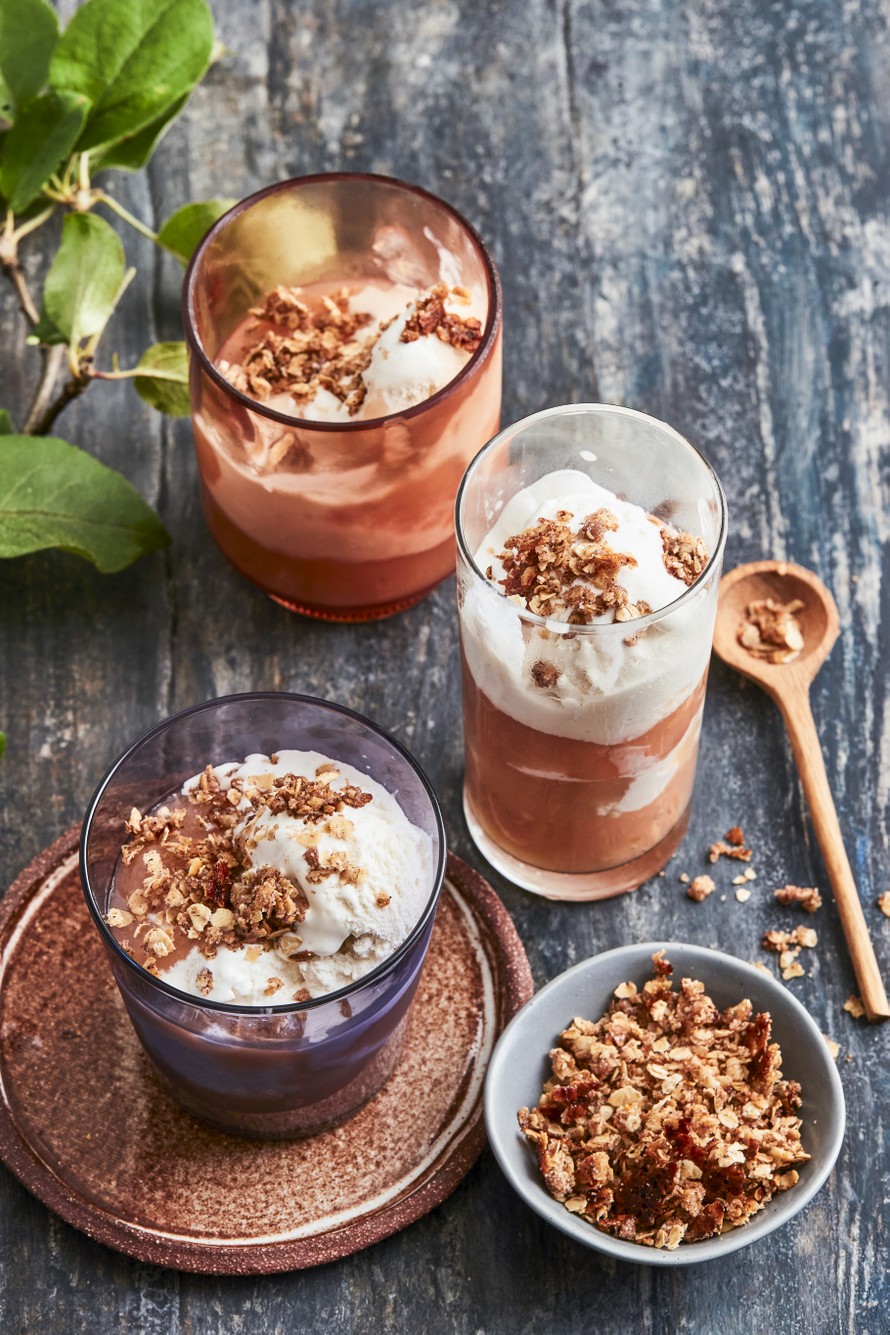 - Annostele kulhoihin vaniljajäätelöä ja omenasosetta. Ripottele päälle granolaa.