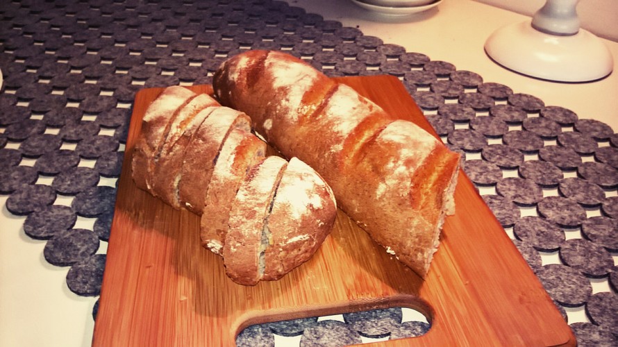 Mittaa kaikki aineet yleiskoneeseen vaivaa n. 10 min. Anna taikinan levätä n.10min. Leino taikinasta 2 leipää, anna kohota liinan alla n 1/2 h. Paista 200 asteessa.