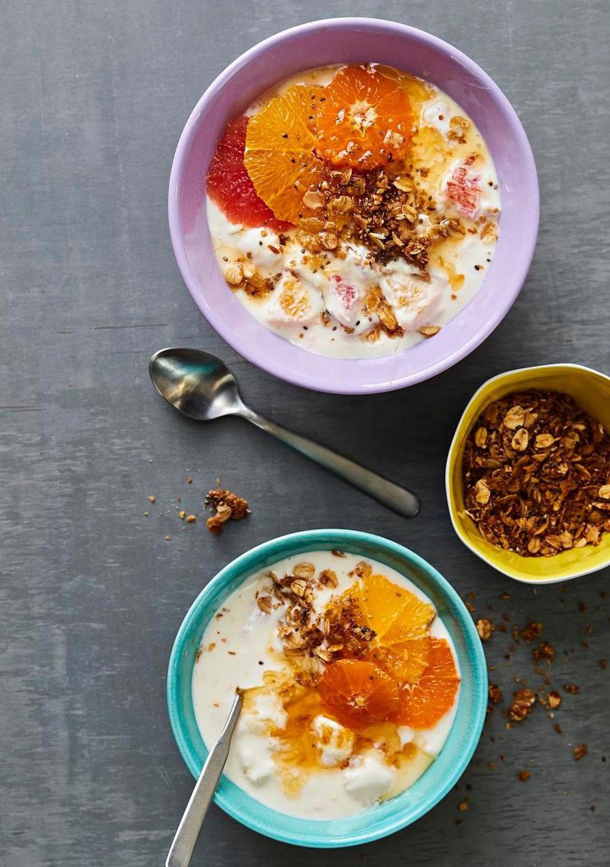 Sekoita rahkan joukkoon mandariinimehu. Leikkaa mieleisiäsi sitrushedelmiä nahattomiksi, pieniksi kuutioiksi. Sekoita hedelmäkuutiot ja hunaja rahkan joukkoon. Lusikoi rahka tarjoilukippoihin ja nauti jäähtyneen myslin kanssa.