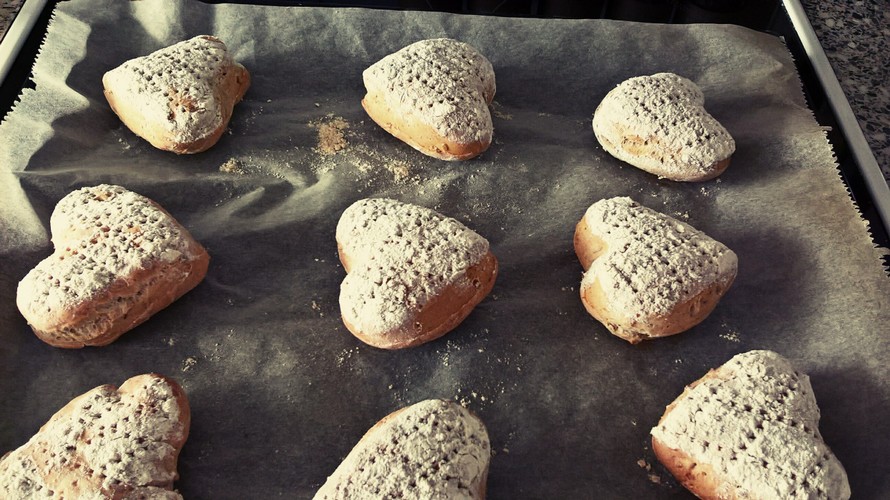 Mittaa aineet kulhoon, vaivaa n.15min. Kohota kulhossa tai pöydällä n.10 min. Kauli taikina n.4 mm paksuiseksi, panele sydän muotilla palasia. Voitele sämpylän pinta vedellä jauhota, painele pintaan reikäkuvio. Kohota n.30 min. Paista 200 asteessa n. 12 min.