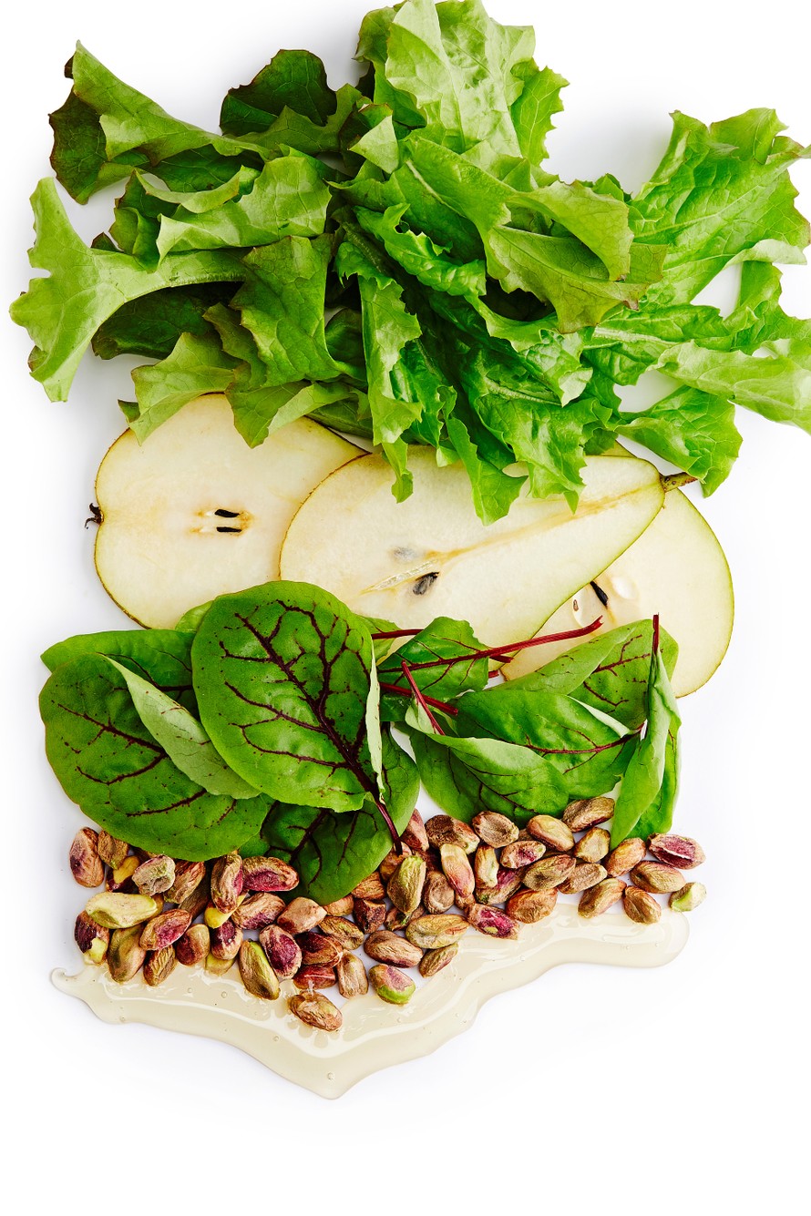 - Huuhtele salaatti ja viinisuolaheinä. Kuori ja halkaise päärynä. Poista siemenkota ja lohko hedelmänpuolikkaat.
