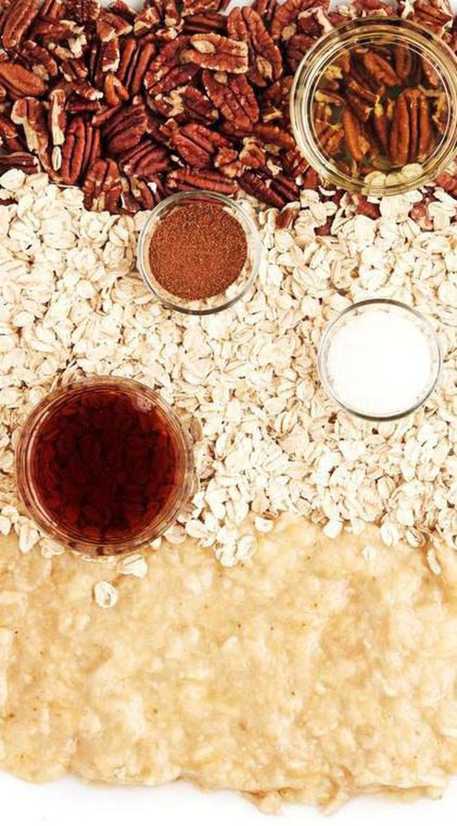 - Lisää kaurahiutaleet, pekaanipähkinät ja mausteet. Sekoita huolellisesti.