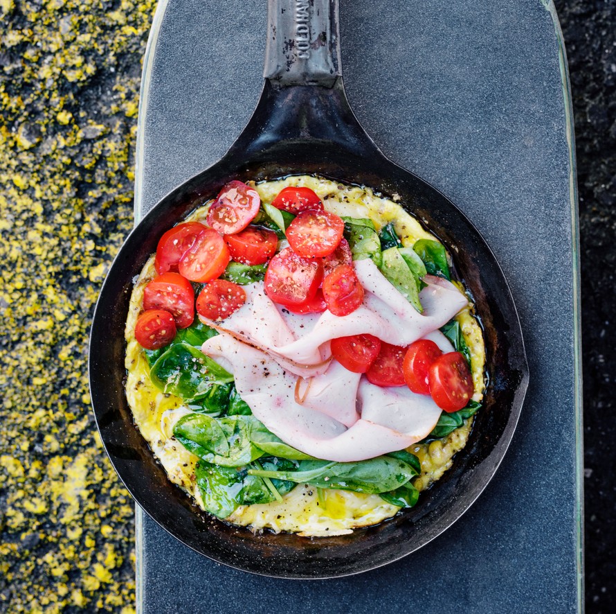 - Kuumenna pinnoitetulla paistinpannulla tilkka öljyä. Lisää pannulle munakasmassa. Siirtele munakasmassaa paistamisen aikana pannun reunoilta keskelle päin, kunnes munakas alkaa hyytymään. Lisää päälle tasaisesti juustoraaste, kirsikkatomaatit, pinaatinlehdet ja kinkkuviipaleet. Kypsennä vielä noin 1 minuutin.