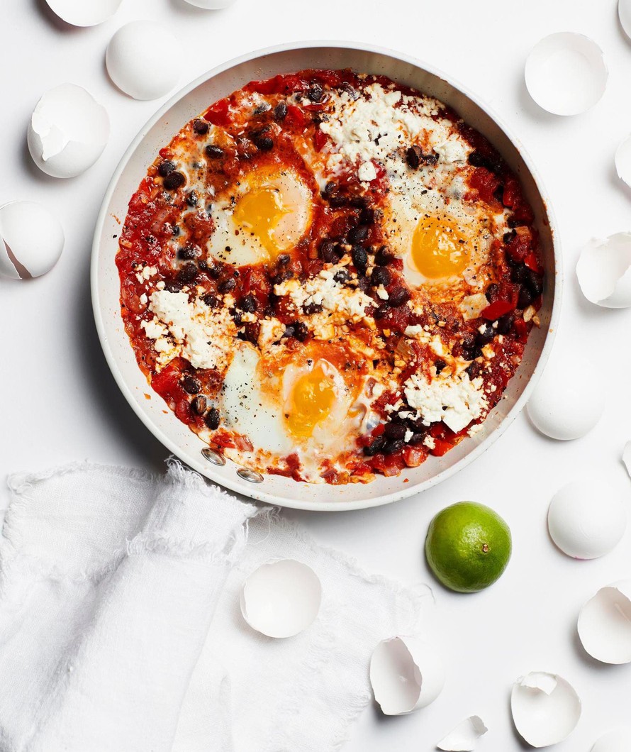 Tee kastikkeeseen 4 koloa ja riko kananmunat niihin. Ripottele loppu mustapippuri ja murenna feta päälle. Laita kansi pannun päälle ja kypsennä noin 8 minuuttia, kunnes valkuaiset eivät ole enää läpinäkyviä.