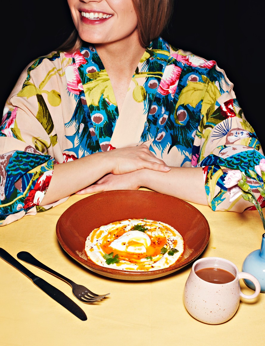 Uppomunat, yrttinen jogurtti ja chilivoi aloittavat aamun pehmeästi. Paahteinen hummus jogurtin alla tuo lisää täyteläisyyttä annokseen.