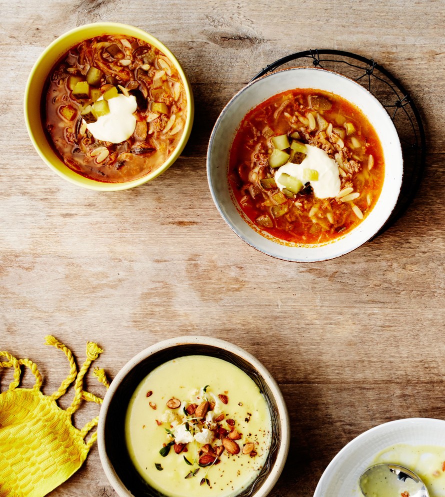 Tarjoa keitto smetanan ja kuutioidun suolakurkun kanssa.