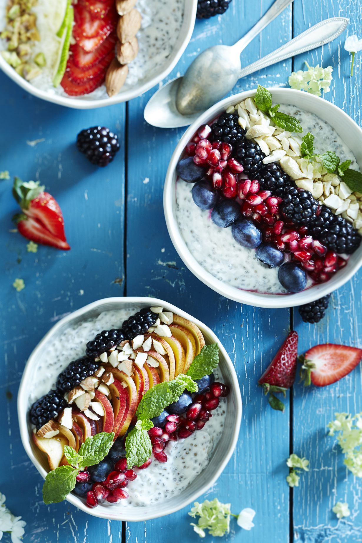 Jaa chia-rahkapuuro neljään kulhoon. Tasoita pinta ja koristele haluamillasi marjoilla, hedelmillä, pähkinöillä ja koristeilla.