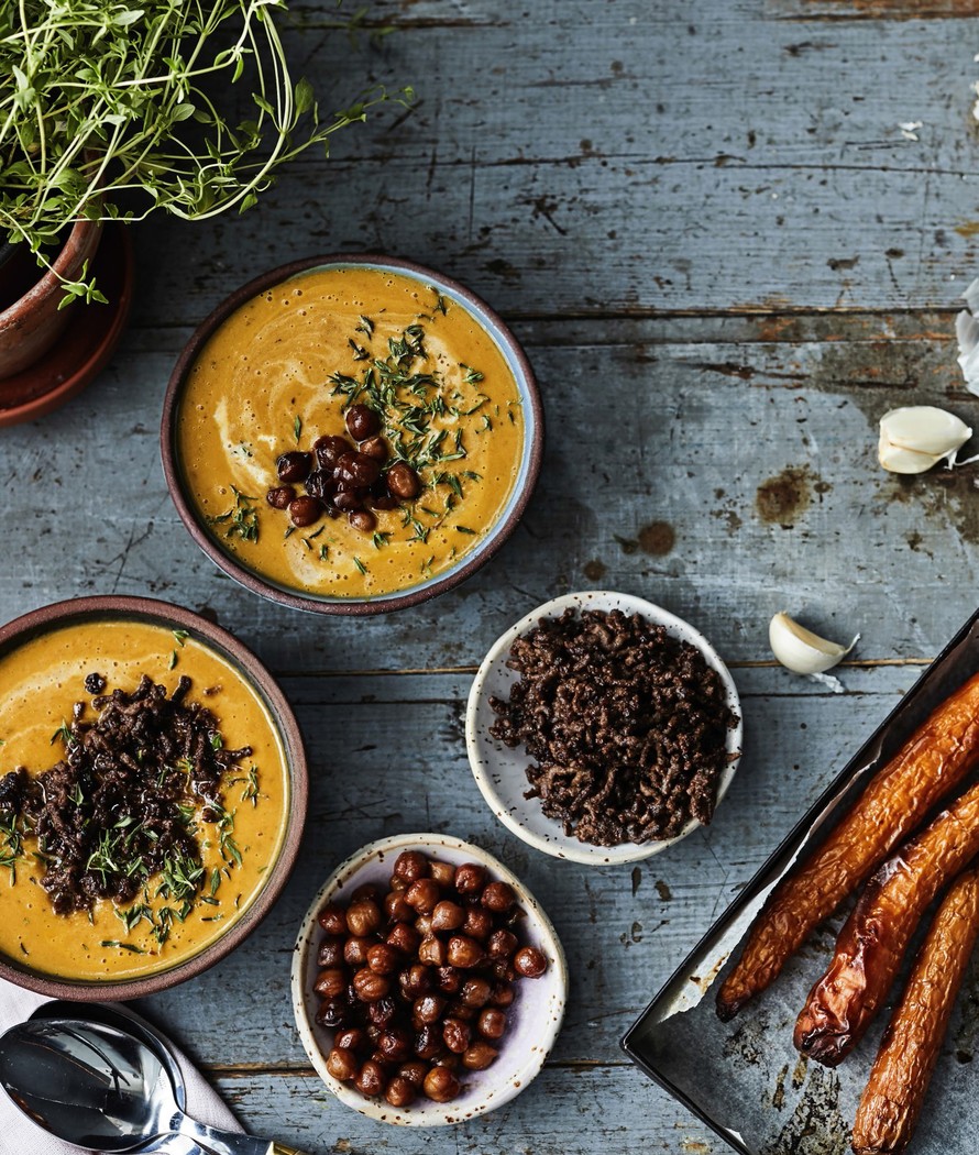 Paahdetuista kasviksista soseutettu keitto on täynnä makua. Jos nuukailet, vaihda tuore timjami kuivattuun.