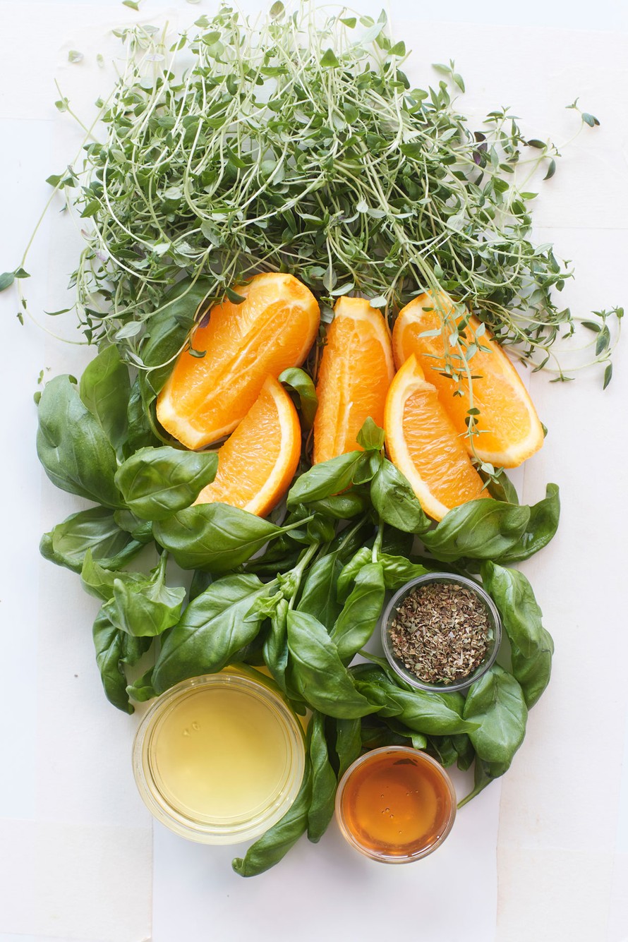 - Nypi ja hienonna basilikanlehdet. Hienonna timjami varsineen. Purista appelsiinista mehu.