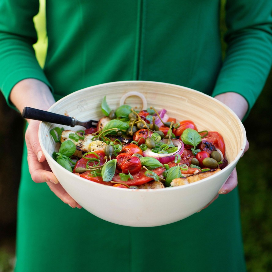 Grillipanzanella on kesän kuumin salaatti! Siinä rapea leipä saa seurakseen parilalla käväisseitä tomaatteja ja maukkaita kapriksia.