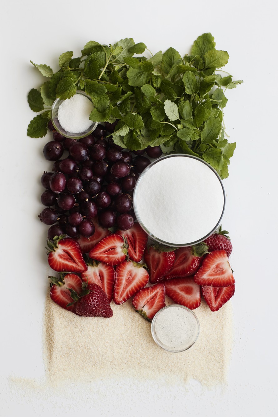 Mansikat makeuttavat karviaisvispipuuron, jossa maistuu myös tuore sitruunamelissa.