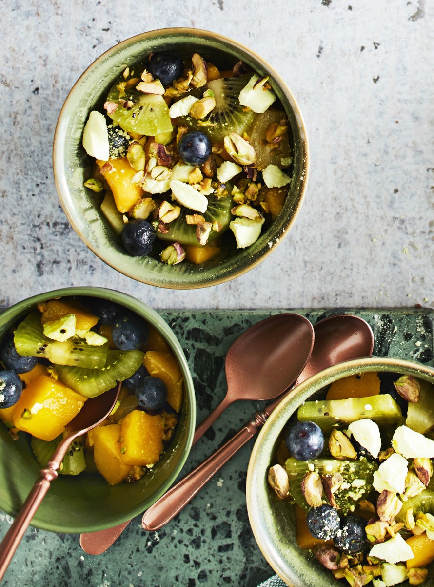 - Pilko mangon ja kiivin hedelmäliha kulhoon. Valuta ananaspalat ja lisää joukkoon. Lisää myös pensasmustikat.