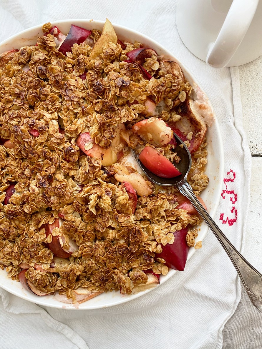 Kauratoskaomenoista on monenlaisia versioita. Oheisessa ohjeessa luotetaan rapean, irtonaisen kauratoskan lumoon. Kun sitä valmistaa reilun kerroksen, kaurapinta toimii kuin kansi, jonka alla omenat kypsyvät meheviksi.