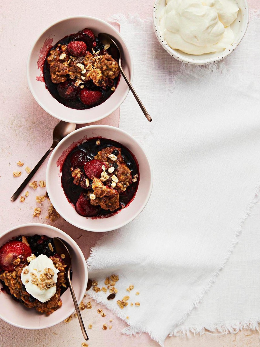 Vinkki! Paistokseen voi upottaa marjoja sen mukaan, mitä pakastimesta löytyy. Tumma intiaanisokeri on täynnä makua, mutta voit käyttää tavallistakin.