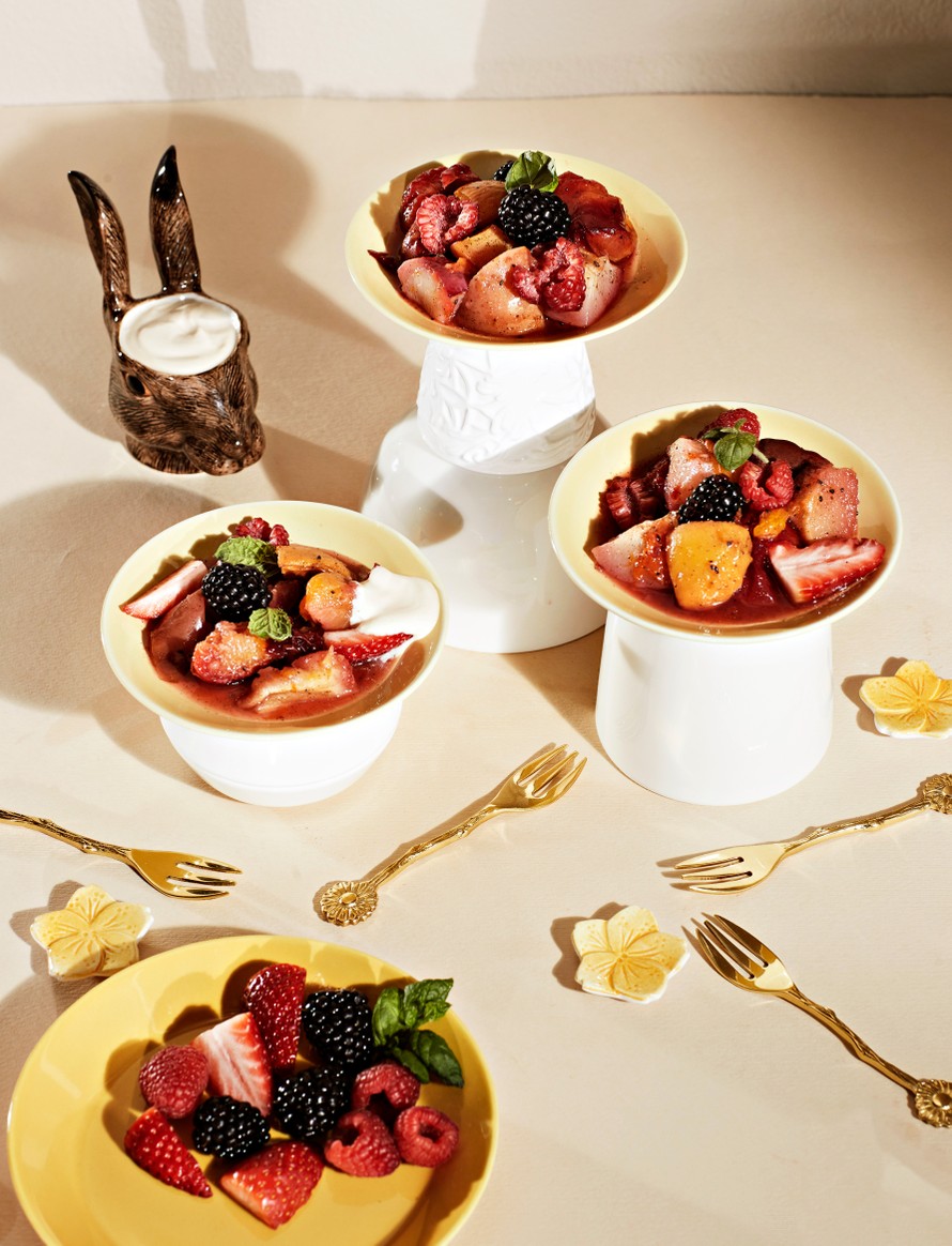 Paista 225 asteessa 20 minuuttia, kunnes hedelmät ovat pehmenneet. Lisää kuumien hedelmien joukkoon tuoreet marjat.