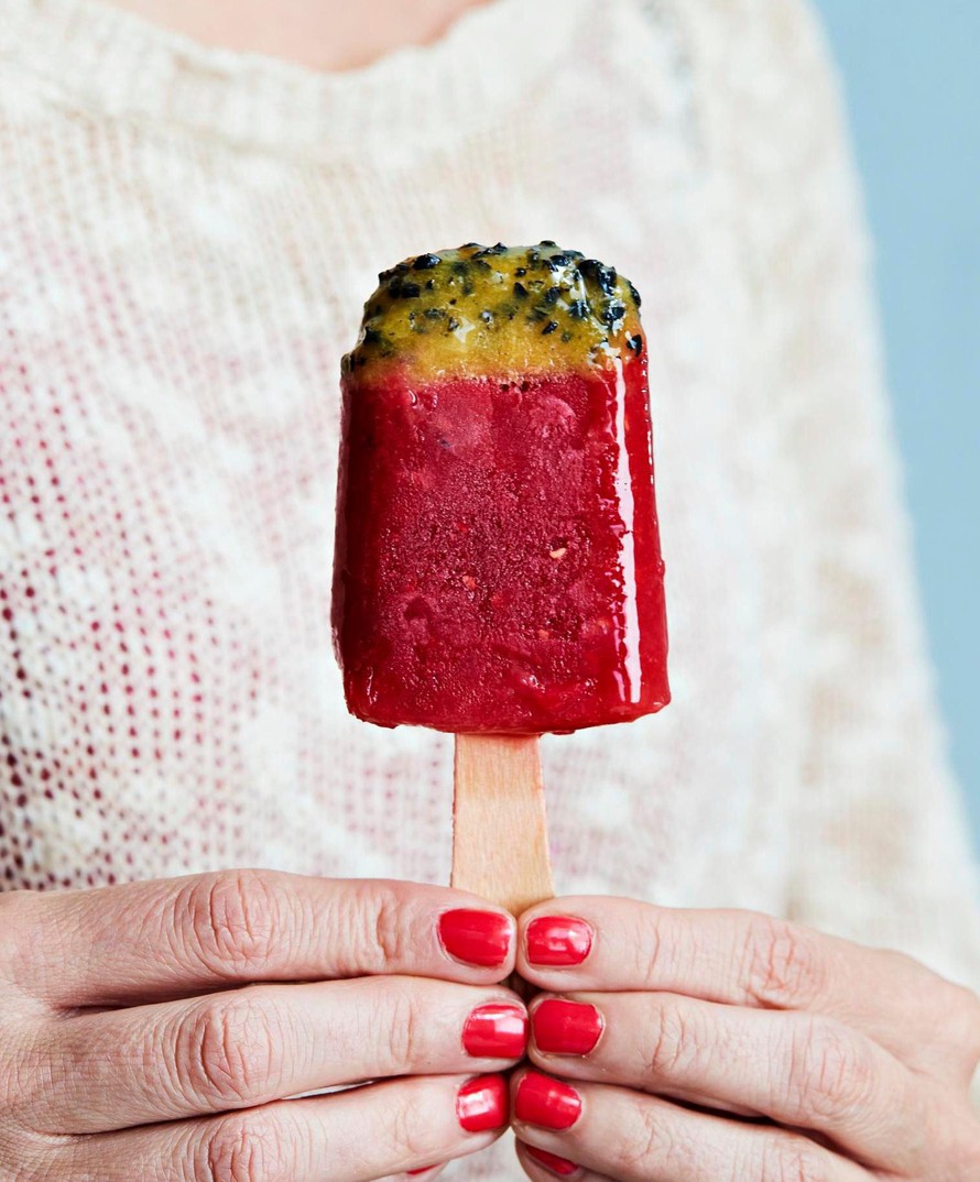 Vadelma ja passiohedelmä on vastustamaton yhdistelmä. Glukoosisiirapin avulla niistä saa ihanat hedelmäjätskit, jotka eivät muutu hileisiksi jäätyessään.