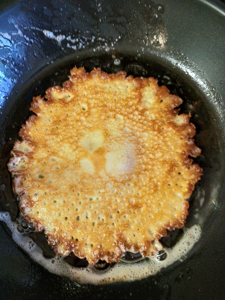 Kun rasva alkaa väreilemään ja tai voi hiukan ruskistumaan on hyvä alkaa paistamaan räiskäleitä. Älä laita räiskäletaikinaa liian paksulti paistinpannuun, räiskäleiden pitää olla ohuita, niin ne ovat ihanan pehmeitä ja reunat rapeita syödä.