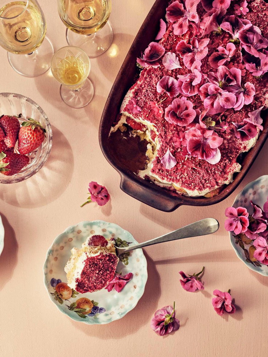 Appelsiinimehuun kastetut savoiardikeksit, mansikkaviipaleet sekä upean punainen vadelmajauhe pukevat tiramisun kesäasuun.