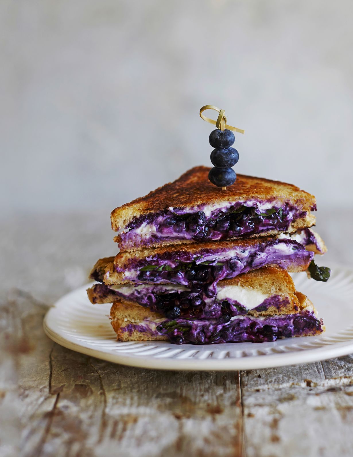 - Jaa vuohenjuusto neljän paahtoleivän päälle. Levitä 2–3 rkl mustikoita juuston päälle (käytä pakastemustikat jäisinä) ja valuta hunaja leiville. Revi basilikanlehtiä ja rouhi mustapippuria päälle. Laita toinen paahtoleipäpala täytteiden päälle.