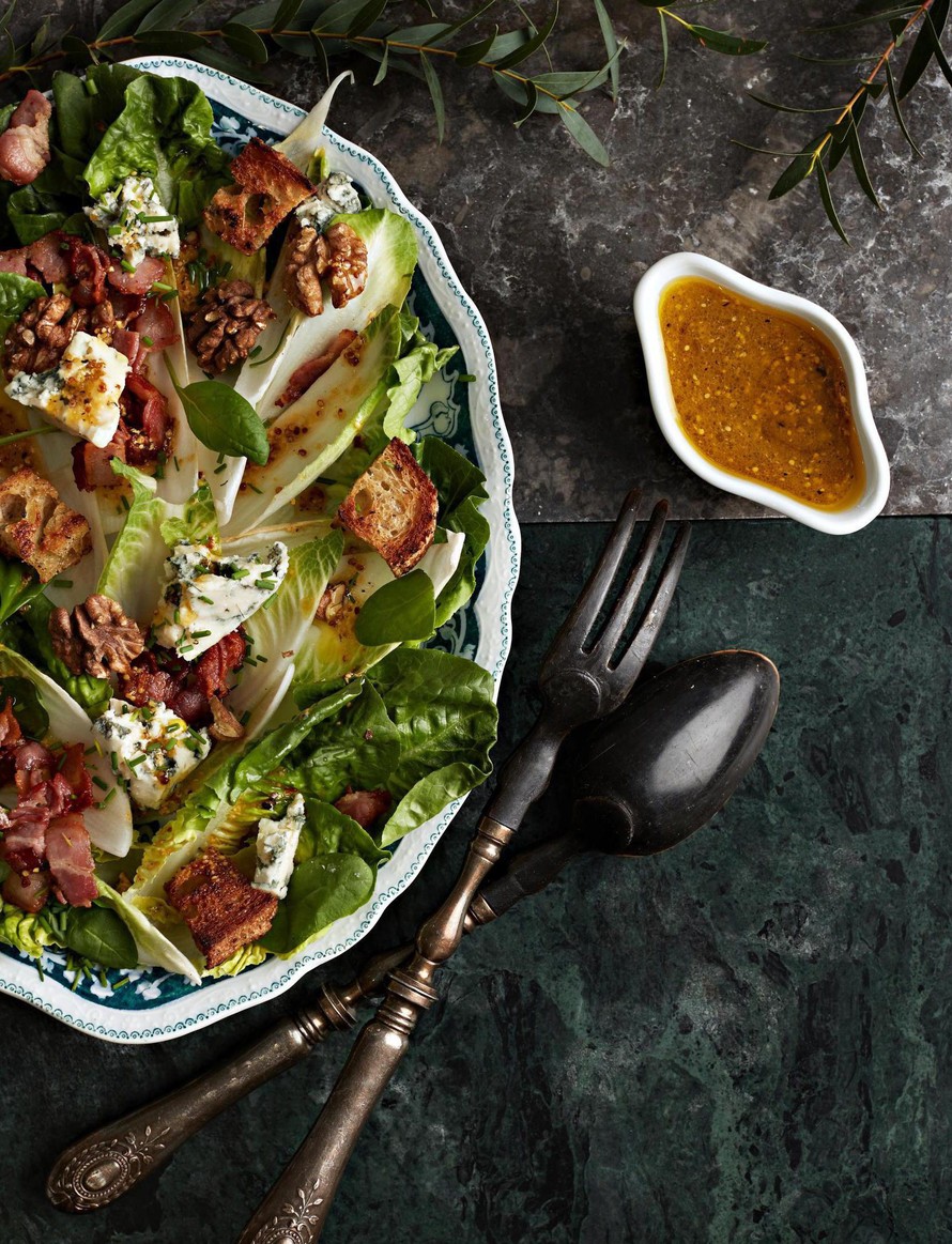 Rapeaa leipää, rouskuvia pähkinöitä ja salaattia. Rasvaista ja rapeaa pekonia sekä pehmeitä salaatinlehtiä että pehmeää ranskalaista sinihomejuustoa. Ylellinen salaatti, eikö vain.