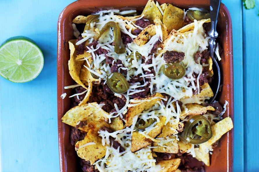 - Kaada jauheliha nachojen päälle ja ripottele pintaan juustoraastetta. Jos haluat tulisuutta, lisää pari ruokalusikallista jalopenoja. Gratinoi uunissa 225 asteessa niin, että juusto sulaa ja nachot lämpenevät.
