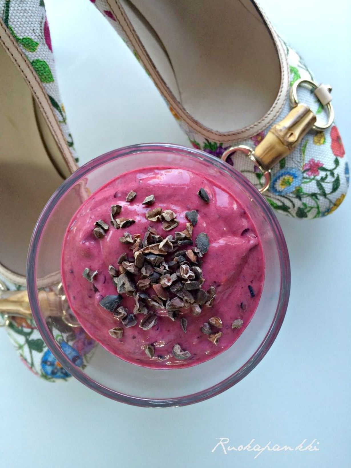 Kaikka vaan tehosekoittimeen ja suuuuuuuuuuuuuuuuuurrrrrrrrr... Aamupala on valmis. Toki voit jättää osan kaakaonibseistä koristeeksi pinnalle. Raikasta ja hyvää!