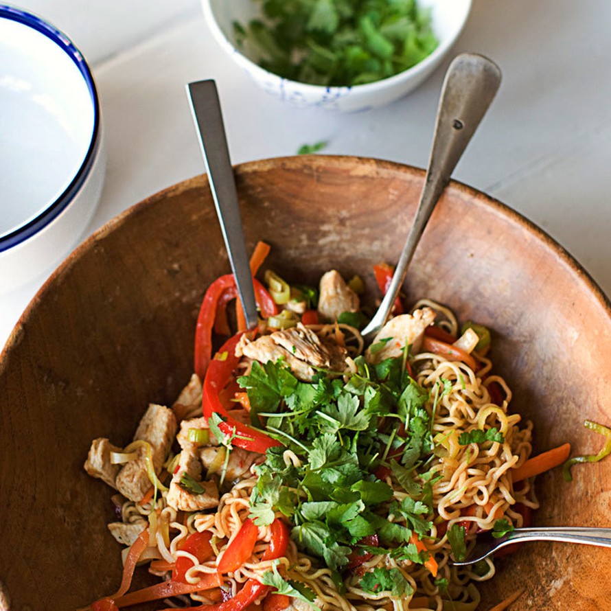 - Lisää valutetut nuudelit, broilerit, chilikastike ja soija. Koristele korianterilla.