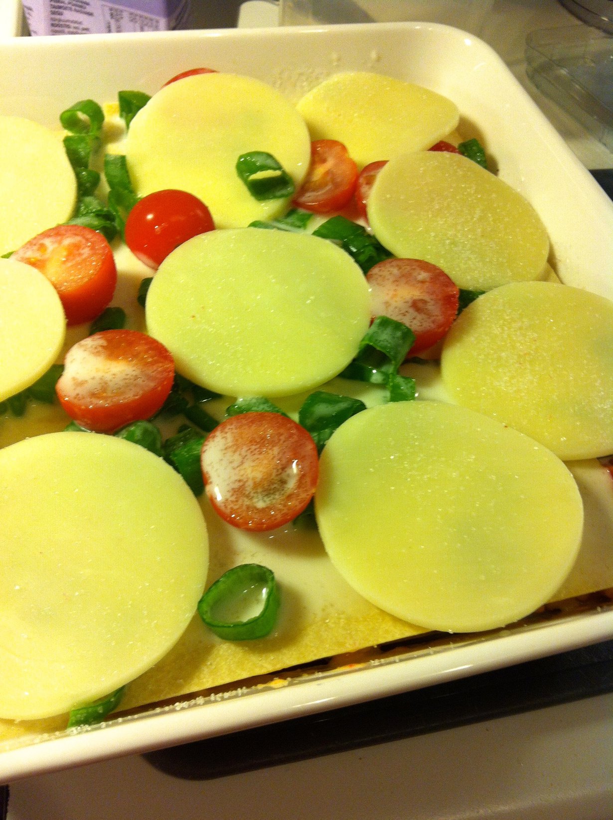 Ota vuoka esiin. Lorauta vähän vettä vuoan pohjalle.(Näin estät lasagnen tarttumasta vuokaan) Lisää seuraavaksi lasagnelevyjä > kastiketta > lasagnelevyjä > kastiketta > lasagnelevyjä. Lopuksi lisää pinnalle pilkotut kevätsipulit ja tomaatit. Lisää juustosiivut kauniisti ruoan päälle ja lorauta päälle kerma. Ripottele vielä päälle sokeria ja suolaa makua antamaan. Paista uunin keskitasolla 40min.