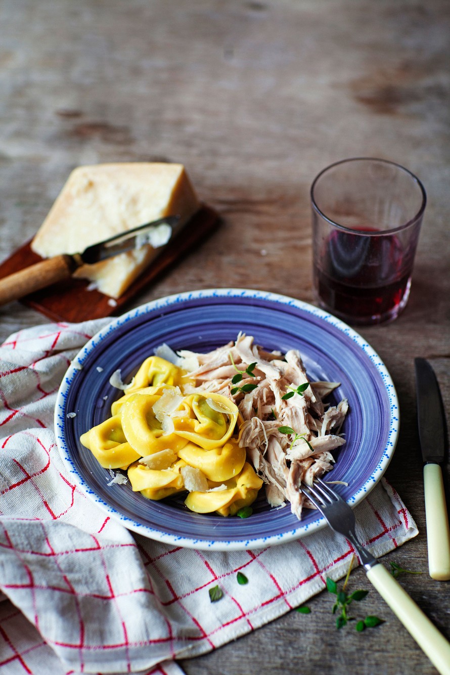 - Keitä tortellinit pakkauksen ohjeen mukaan kanaliemessä. Tarjoile raastetun parmesaanin ja riivityn lihan kanssa.