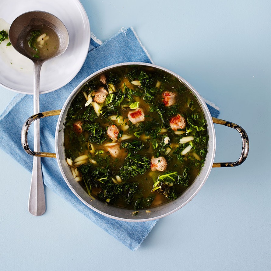 - Keiton kypsyessä pese ja leikkaa lehtikaali ohuiksi suikaleiksi. Jätä paksut lehtiruodit käyttämättä. Lisää kaalisuikaleet kattilaan, käännä lämpö pois ja anna keiton hautua vielä 5 minuuttia.