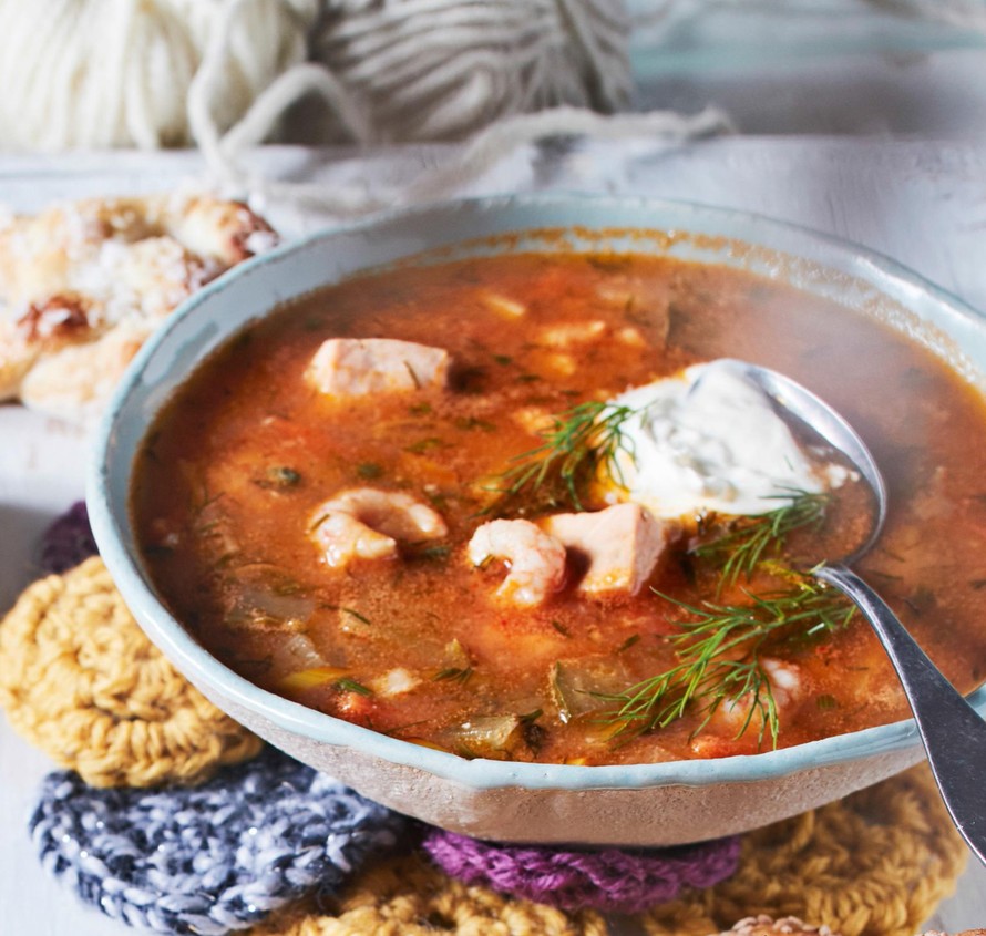 - Tarkista maku ja lisää tarvittaessa suolaa (sitä saattaa olla jo riittävästi, jos keittoon on käytetty suolaista kalalientä ja suolakurkkua). Tarjoa smetananokareen ja halutessasi kapristen kanssa.