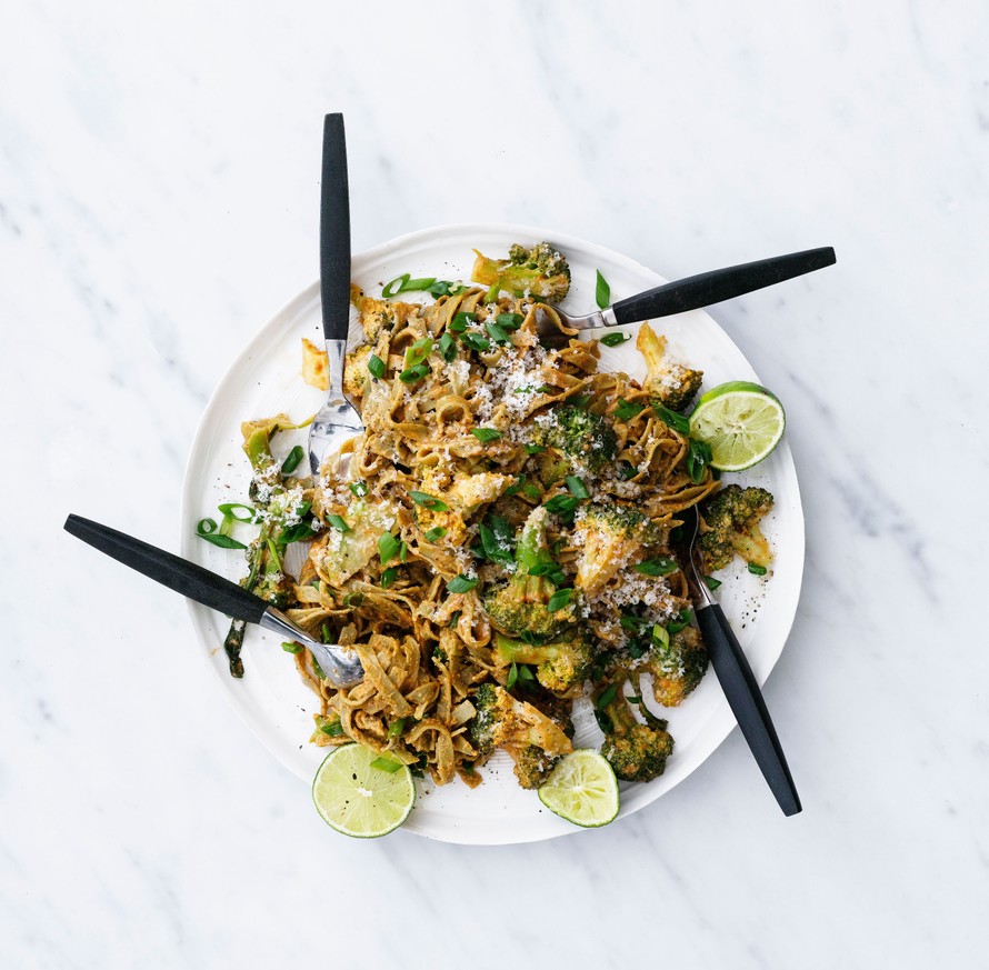 - Sekoita maapähkinäkastike kypsään pastaan ja lisää tilkka keitinvettä, mikäli pasta tuntuu liian kuivalta. Lisää hienonnetut kevätsipulinvarret pastan joukkoon ja tarjoa heti limettilohkojen kera.