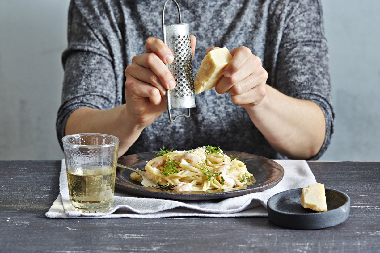 Spagetin kiehuessa raasta parmesaanijuusto ja sekoita keskenään Arla Lempi Valkoviini & tilli -ruokakerma ja kananmuna.