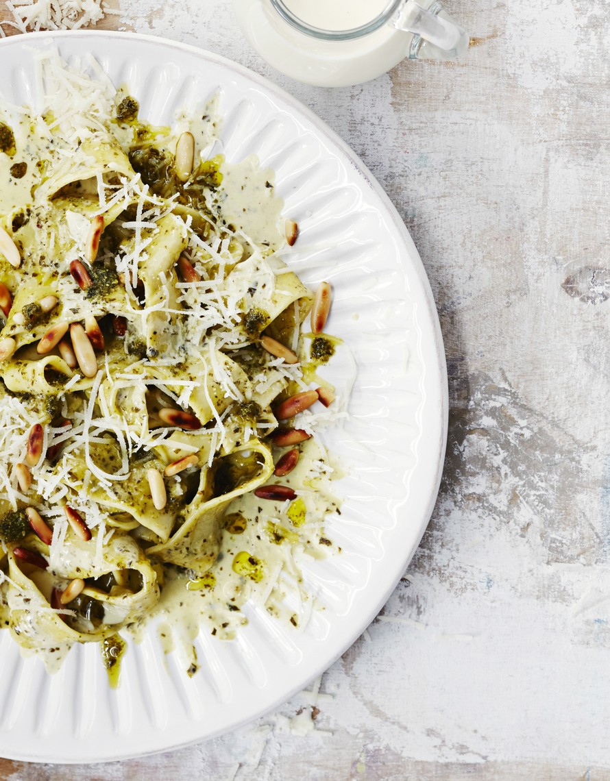 - Kaada kerma pannuun ja kiehauta. Lusikoi joukkoon pesto ja keitä kastiketta kasaan 3 minuuttia. Mausta mustapippurilla. Nosta sivuun odottamaan.