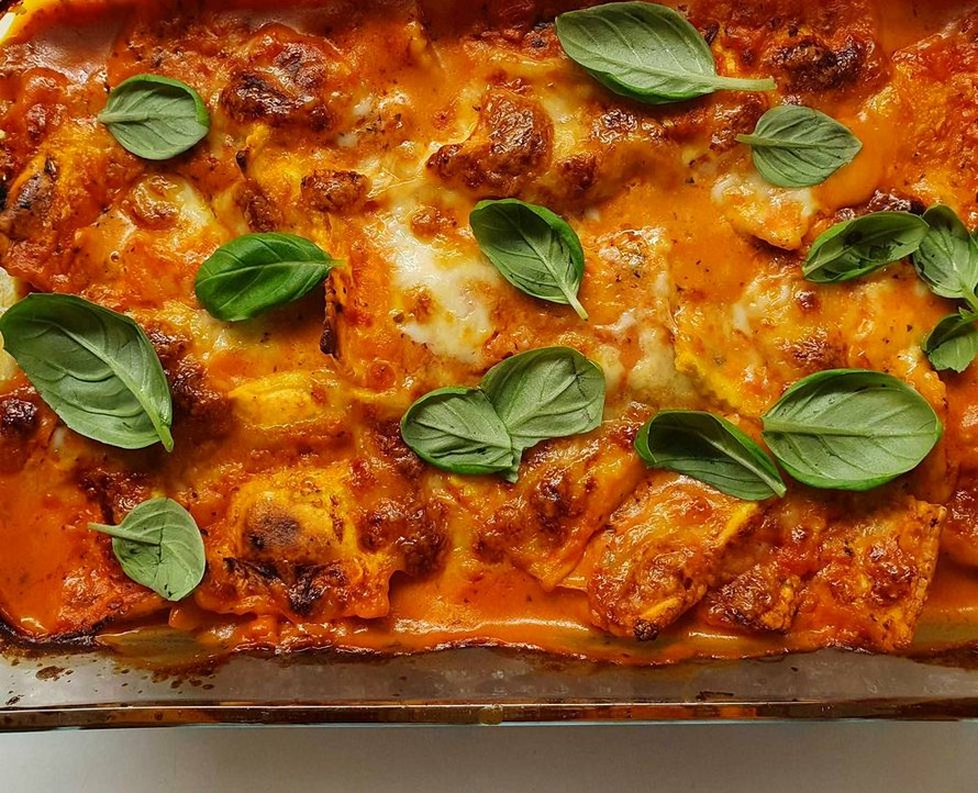 Instagramissa julkaistu video näytti alkuun kuitenkin ehkä hieman erikoiselta. Kommenteissakin mainittiin, että se näytti siltä, kuin pastaa olisi sekoitettu sulaneeseen jäätelöön. Raviolit, tomaattikastike, kerma ja mozzarella sulavat kuitenkin uunissa ihanasti yhteen.
